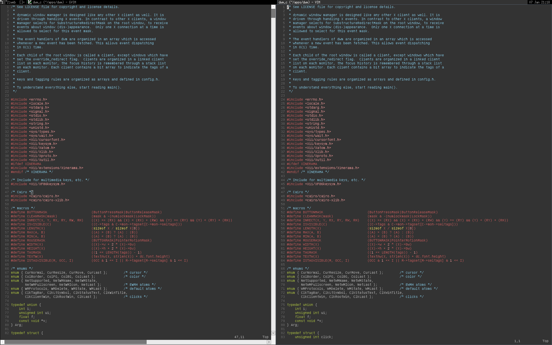 Screenshot of VIM theme relaxed on the left is gvim (GUI), on the right is vim in urxvt (terminal)